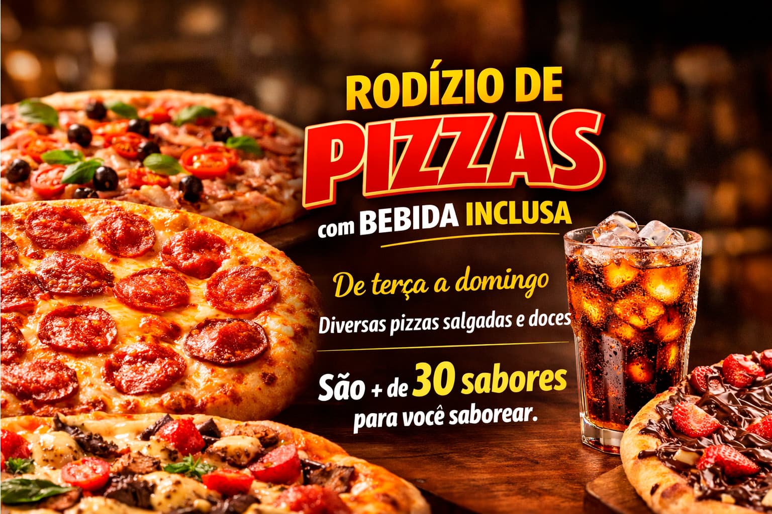 O nosso cardápio atende todos os públicos e situações. Seja para uma pizza em casa com a família, um jantar romântico a dois ou mesmo um happy hour com os amigos. Contamos com mais de 40 tipos de pizzas deliciosas, diversas cervejas importadas e uma selecionada carta de vinhos.